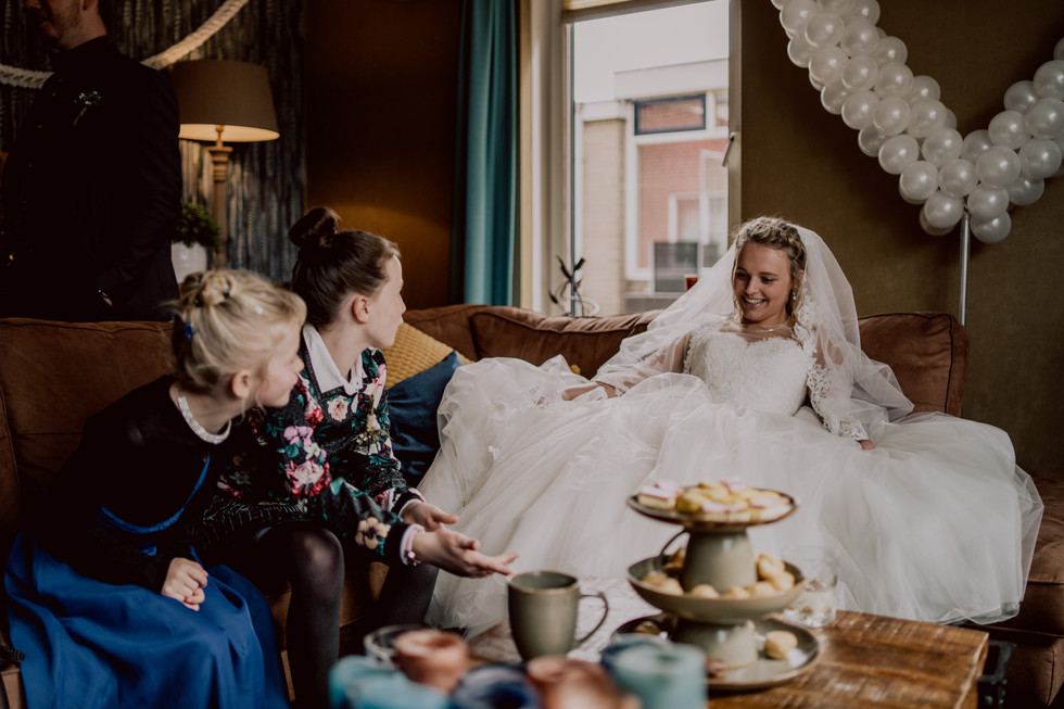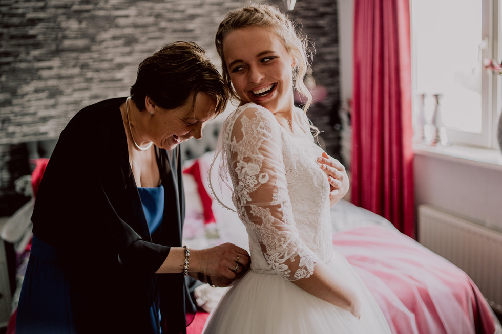 6 uur ging de wekker weer, ik vloog naar het ontbijt en probeerde nog wat inspiratie op te doen voor de trouwfoto's. Heel gek maar mijn spanning was bijna helemaal verdwenen, ik pakte mijn tas in, zorgde dat alle camera's werkte en ging op weg naar Fam. Boogaard. Daar aangekomen ging ik gelijk aan het werk en de eerste foto's van een trouwerij waren een feit. Alleen het begin al vond ik enorm vet! De uitdaging die er ligt om goede foto's in een huiskamer te maken is geweldig, dat motiveert mij om het beste eruit te halen. Dit probeer ik natuurlijk altijd te doen, maar in een huiskamer is dit altijd wat lastiger als in de natuur of op een fotogenieke plek.